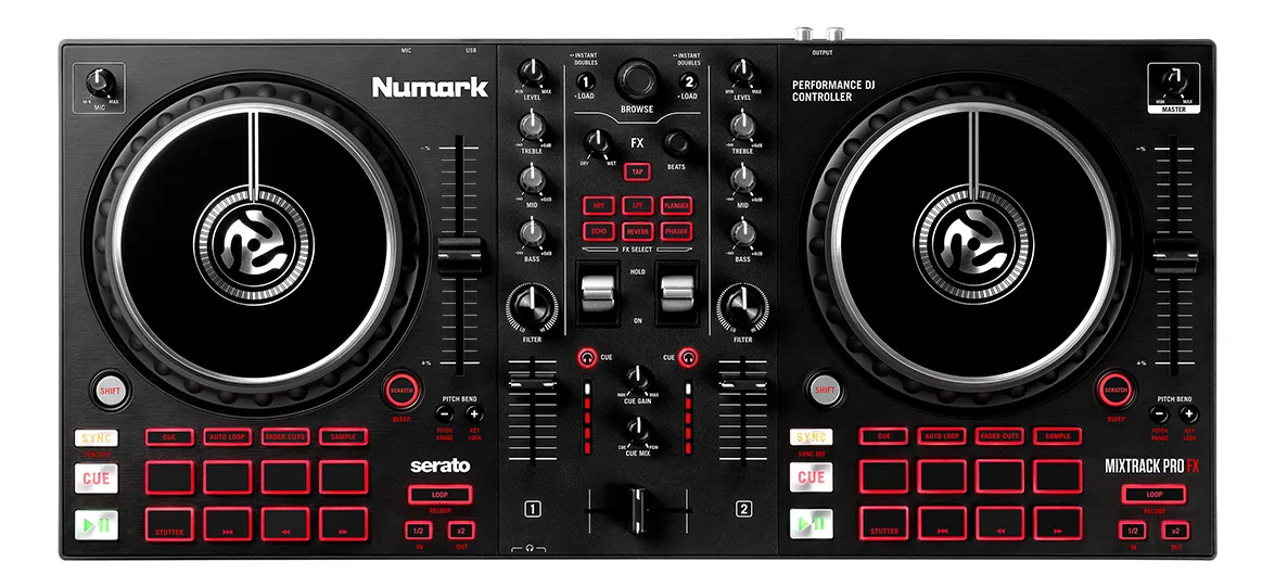 A controladora Numark Mixtrack Pro FX oferece um desempenho profissional para DJs, com jog wheels sensíveis ao toque, decks duplos e integração total com o software Serato DJ. Ideal para mixagens fluidas, possui botões dedicados para efeitos (FX) que permitem controle dinâmico e criativo durante suas apresentações. O mixer de 2 canais conta com crossfader ajustável, faders lisos e equalizadores precisos, garantindo total controle sobre o som. A interface USB plug-and-play facilita a conexão com seu computador, tornando o setup rápido e prático. A construção robusta, com acabamento em preto fosco, alia durabilidade e estilo. Inclui saídas RCA para conexão a sistemas de som externo e entrada para microfone, ampliando suas possibilidades de performance. Contém também pads de performance retroiluminados para samples, hot cues e loops, ampliando sua versatilidade em apresentações ao vivo.